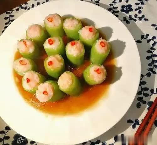蒜蒸丝瓜酿虾滑食材:丝瓜2根、虾仁200g、蒜末20g