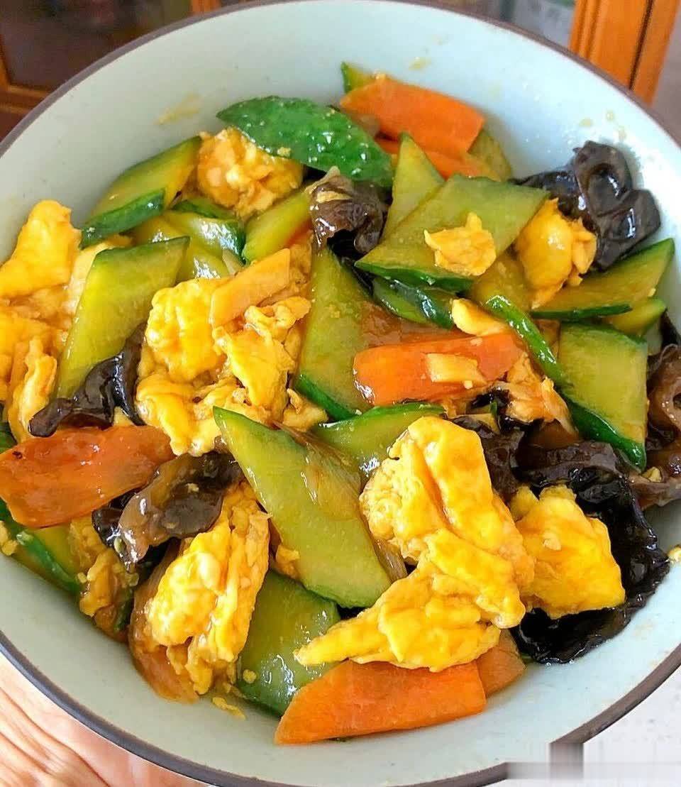 黄瓜炒木耳鸡蛋食材准备:黄瓜1根、木耳适量、鸡蛋2个、蒜2瓣、盐适量、生抽1小勺、食用油适量。