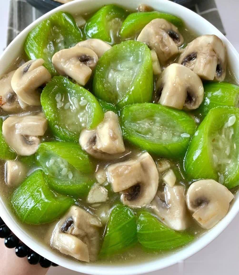 丝瓜炒口蘑主要食材:丝瓜两条,口蘑8个,香葱1根,大蒜3个,盐1小勺,味精1小勺,玉米淀粉1半勺,食用油适量