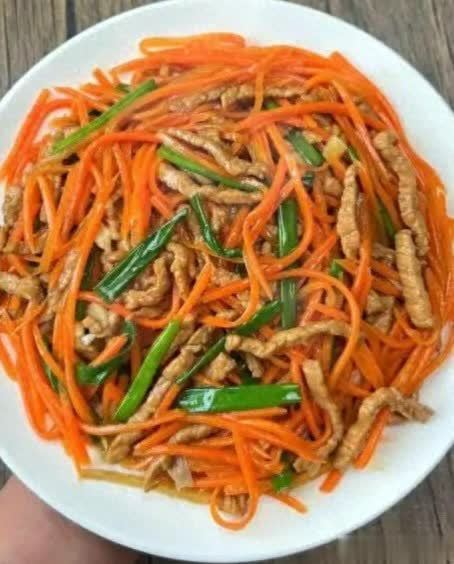 胡萝卜炒肉丝材料:胡萝卜1根、猪瘦肉150克、青蒜2根、生抽1勺、料酒半勺、淀粉半勺、盐适量、食用油适量。
